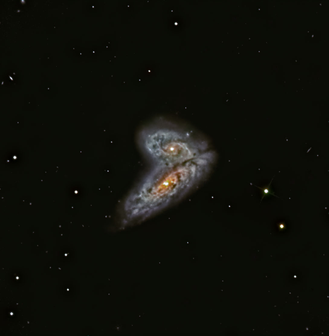 This is the entangled duo NGC4567 and 4568. They lie in Virgo about 52 million lys away. The pair is quite close with their cores separated by only an estimated 20,000 lys. Their basic structures, including the spiral arms, are still intact despite the proximity of the two. However, studies show the highest star formation is taking place where they overlap.