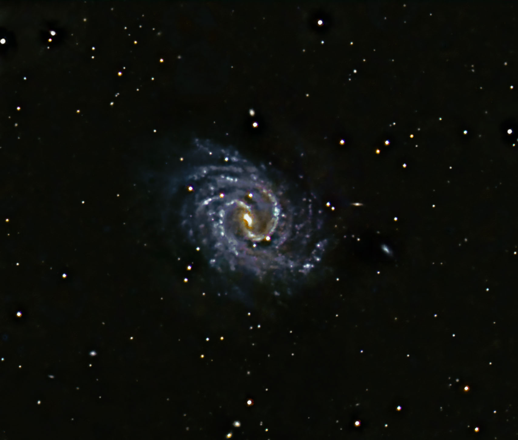 Two major arms with spurs. Pretty uniform in appearance, although the bottom right arm seems splayed out some and displays star burst activity. The galaxy on the right side seems too small/distant to be the cause – so probably an interaction with another member of the Virgo cluster at one time.