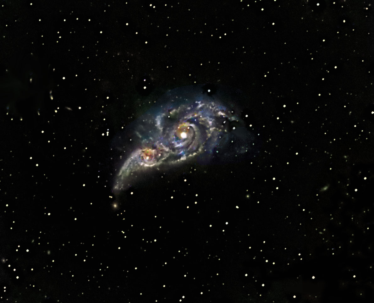 This is an image of two galaxies in the process of merging. IC2165 is the smaller one in the back, and NGC2207 is in the front. The nearest previous collision point is estimated to have taken place 40 million years ago. The gap between the two is cycling closer, and it is estimated that the 2 will finally collide in about another billion years.